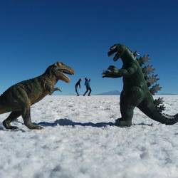 Nach dem die Sonne weit oben am Horizont stand gabs erst mal direkt an der Insel Frühstück und dann ging es auf dem Salzsee an ein Punkt wo man nichts auser den weißen Salz sieht und dies nun der perfekte Platz um die berühmten Bilder zu machen mit optischer Täuschung. Vom Spielzeugdinosaurier der ganz groß auf dem Bild erscheint bishin das ich als Rieße wirle und Nizan mit dem Fuß zerquetsche. Das ultimative Highlight Bild war mit der Käsereibe. Kurzer Hintergrund zu der Reibe. In Pucon hatte mir Lena eine Käsereibe aus dem Supermarkt geschenkt weil ich immer ein spezial Gericht aus Spanien machen wollte wozu man mit einer Reibe die Tomaten reiben muss. Alle Hostels hatten in der Küche nie eine Käserreibe und sie machte mir dann dieses tolle Geschenk. Hab mich auch unfassbar gefreut nur sie ist einfsch sooo rießig und mein Rucksack ist schon kurz vor dem platzen aber sie ist immer mitgereist auch wenn sie manche drüber lustig gemacht haben die Reibe war mir wichtig. Nun hatte sie auch ihren größten Nutzen. Nizan hatte eine geile Idee. Ein Bild machen wo mich jemand auf der Käsereibe reibt. Somit hatt Rory mich an den Beinen hoch genommen und mich gerieben. Ist ein geiles Bild geworden.