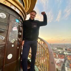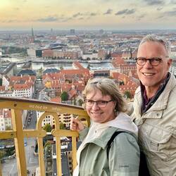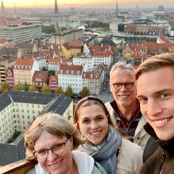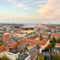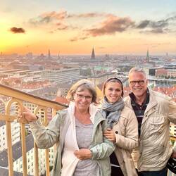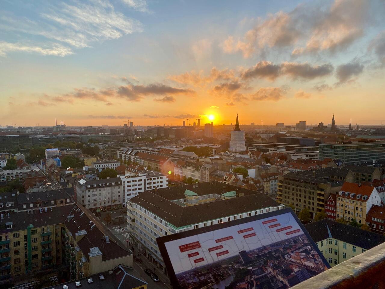 Auf Tobias' Wunsch hin besuchten wir danach die Vor Frelsers Kirke (zu Deutsch Erlöserkirche), welche durch ihren speziellen Turm schon von weitem auffällt. Marina und Tobias waren bei ihrer Städtereise nach Kopenhagen vor rund 9 Jahren schon einmal auf dem Kirchenturm, woran sich Tobias aber überhaupt nicht mehr erinnern kann. Wir erfüllten ihm diesen Wunsch und erklommen die ca. 400 Stufen bis zur Turmspitze, wobei die letzten 150 davon ausserhalb der Turmspitze entlangführen. Die Turmspitze dreht sich gegen den Uhrzeigersinn und somit eigentlich in die «falsche» Richtung. Der Legende nach soll sich darum ihr Architekt vom Turm gestürzt haben. Ganz ungewollt hatten wir den Besuch genau richtig eingeplant, sodass wir in den Genuss des Sonnenuntergangs kamen.