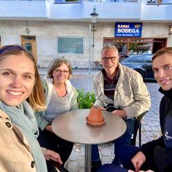 Eigentlich wollten Marinas Eltern am Montag Fahrräder mieten und damit entlang der Nordküste von Seeland radeln. Allerdings schliefen wir alle etwas länger, und bis die Fahrräder gemietet werden konnten, dauerte es auch noch eine Weile. Darum beschlossen Jutta und Gallus noch eine Nacht länger in Kopenhagen zu bleiben, da sie bis Einbruch der Dunkelheit mit dem Fahrrad nicht so weit gekommen wären. So machten Tobias und Marina mit ihnen eine Stadtführung mit dem Fahrrad. Wir radelten durch Christianshavn und machten dann eine Bier- und WC-Pause bei einer kleinen Bodega am Kanalrand. Dank den Heizstrahlern, über die fast jedes Restaurant mit Aussenbereich verfügt, war es schön gemütlich.