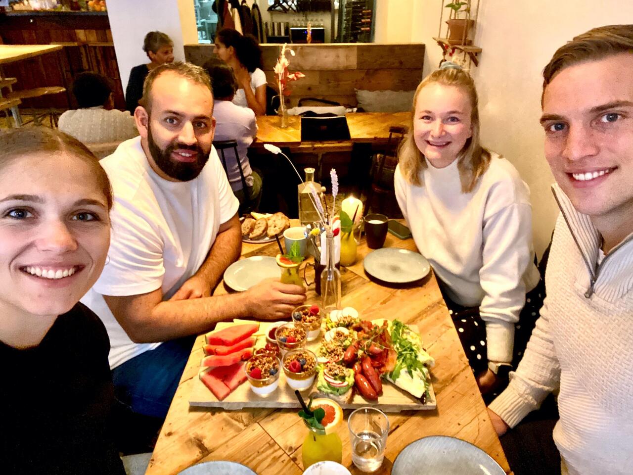 Anschliessend brachte Max Tina zum Flughafen und wir konnten glücklicherweise mit zwei Mitspielern von Tobias nach Hause fahren. Zum Abendessen hatten wir libanesische Köstlichkeiten aus dem Restaurant "Mahalle" bestellt, die wir mit selbstgemachten Dips und Salaten servierten.