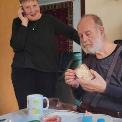 Heute hat der Opa Geburtstag. Nach dem auschecken holte uns Manne in Warnemünde ab und wir fuhren zum Frühstück zu Oma und Opa. Natürlich mit Geschenken.