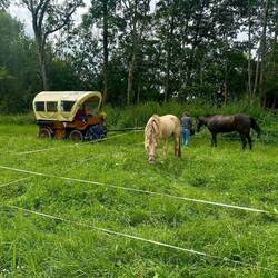 Heute morgen haben wir hinter dem Wagen ein kleines Stück Wiese für die Pferde eingemacht, denn auf der Koppel stand kein Gras.