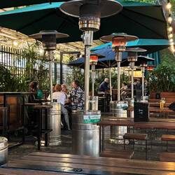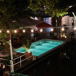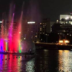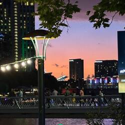 Nach 9 km Stadtbesichtigung haben wir uns einen Drink im nächtlichen Melbourne in einer entzückenden Bar al fresco am Yarra River verdient.