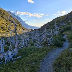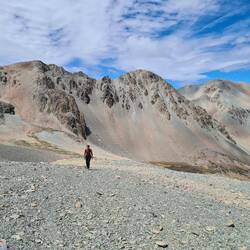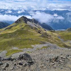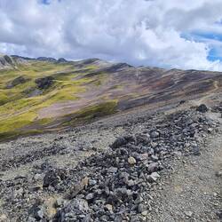 Los of de Mount Robert Circuit hemmer erscht nochere för üse Campervan usefordernde Afahrt chönne. Med liechtem Gepäck semmer los ond hend de Ufstieg zögig hender üs brocht. Mol weder ned zfrede med de ehm botnige Ussecht hed de Dani sini neue Schueh amene erschte Stresstest onderzoge ond hed no paar Höhemeter meh gmacht - im Laufschritt, wies sech förne Trailrunner ghört. Es hed sech so semi glohnt. Aber d'Schueh hebed.