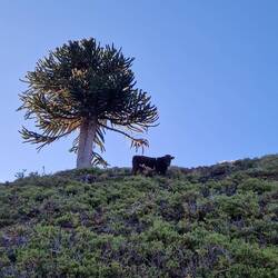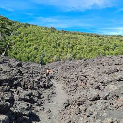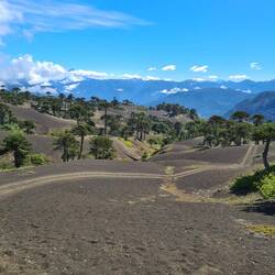Am erschte Tag hemmer de Sierra Nevada Trail gmacht. De Vulkan Llaima hemmer jo am Vorobig scho us de Färni gseh, hött semmer nöcher äne cho. D'Stross zom Usgangsponkt vo de Wanderig hed üs öberne grösseri Flächi us pyroklastischem Material gfüehrt ond hed usgseh wiene Mondlandschaft. Passenderwiis, so heds üs de Javier verzellt, heisst die Landschaft au "Plano de la luna". Spöter, ofem Wanderwäg, hemmer emmer weder Abschnett gha, wo de Ondergrond merklech "vulkanisch" gsi esch onds sech so afgühlt hed, als wörd mer of schwarzem Chatzesand laufe. Speziell send för üs au d'Aurakarie gsi, e Baumart, wo v.a. i dere Region vorchond ond de Provinz au ehre Name gäh hed. Met ehrne schoppige Äscht gsähnds us als wördeds scho set johrmillione dostoh ond zäme met em Vulkan im Hendergrond hätts üs gar ned so öberrascht, wenn do plötzlech no en Dinosaurier is Beld gloffe wär. Stattdesse hemmer vel Eidechse ond au Spächte gseh, wobii mer die meh ghört als gseh hend.