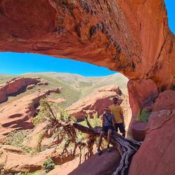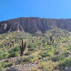 Am nöchschte Tag semmer, nochdem mer no chorz in Humahuaca am Märt send go förs z'Nacht iichaufe, wiiter i Norde gfahre, wo mer d'Inca Cuevas hend welle go aluege. D'Wanderig det äne esch mehrheitlech im/näbeme uströchnete Flossbett gsi, was sech chli zoge hed. Am Ziel acho hed en Guide metere ganze Hondeschar gwartet ond üs e Füehrig dör die leider dör Vandalismus veronstalteti Höhli gäh. Im Aschloss hemmer die nöcher Omgäbig vo de Höhli of eigeti Fuscht chönne erkonde ond hend gstuunet abere "Oase" im Schatte vom Felse, Fänschter, Lagune ond Chinchilla-ähnleche Tier. Öbernachtet hemmer, of Arote vom geschtrige Gastgäber, in Maimara. Wie scho in Hornocul esch au de Hang vis-à-vis vo üsem Hüsli rägebogefarbig gsi, leider hemmer bem gmeinsame Choche d'Ziit chli vergässe ond so leider d'Sonneomdergangsstemmig verpasst.
