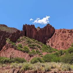 Mit einem Guide unternehmen wir heute die erste Hälfte eine Erkundungstour rund um Tupiza. Zunächst fahren wir zu einer bizarren Gesteinsformation namens Poronga (laut chatpgt "ein vulgärer Ausdruck, der im allgemeinen Sprachgebrauch als umgangssprachlicher Ausdruck für das männliche Genital verwendet wird"). Die Bezeichung passt auch, der ca. 80m hohe obesliskartige Felsen erinnert durchaus daran ...