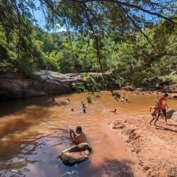Auf dem Weg dorthin passieren wir ein ganz idyllisches Flusstal, vor dem die roten Felsen wunderbar leuchten.