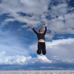 In seiner Ruhe ist der Tag also alles andere als langweilig, und aufgelockert wird er durch ein ganz apartes Mittagessen, das unser Guide Cristian für uns inkl. Tisch und Stühlen, Tischdecke etc. mitten im Salar aufbaut. Am Nachmittag macht er dann zuerst mit uns vieren, dann mit Emil und Luzie, die mehr Freude daran haben, eine Fotosession, bei der er die besonderen Bedingungen der Salzwüste in Bezug auf die Perspektive nutzt.
