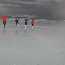 - Aus großen Löchern sprudelt Wasser hervor, aus der Tiefe des ehemaligen Sees emporgedrückt. (Die gesamte Salzfläche (bis zu 30 Meter dick) schwebt quasi auf einem reichen Salzsee, und kleine Flüsse befördern die Kristalle durch das Wasser an den Rissen in der Kruste nach oben. Und wie tief der See ist, weiß bis heute niemand so genau, man hat nur an zwei Stellen Messungen durchgeführt, die keinerlei Anhaltspunkte geben.)