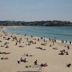 Vi åker kollektivtrafik till legendariska Bondi Beach i Sydneys östra förorter för att tillbringa halvdagen innan vi ska flyga till Nya Zeeland.
