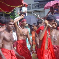 "Perahera" in Dodanduwa. Peraheras werden meist aus religiösen Gründen initiiert und starten in der Regel von einem Tempel aus. Mitunter ist allerdings davon nicht mehr viel übrig.