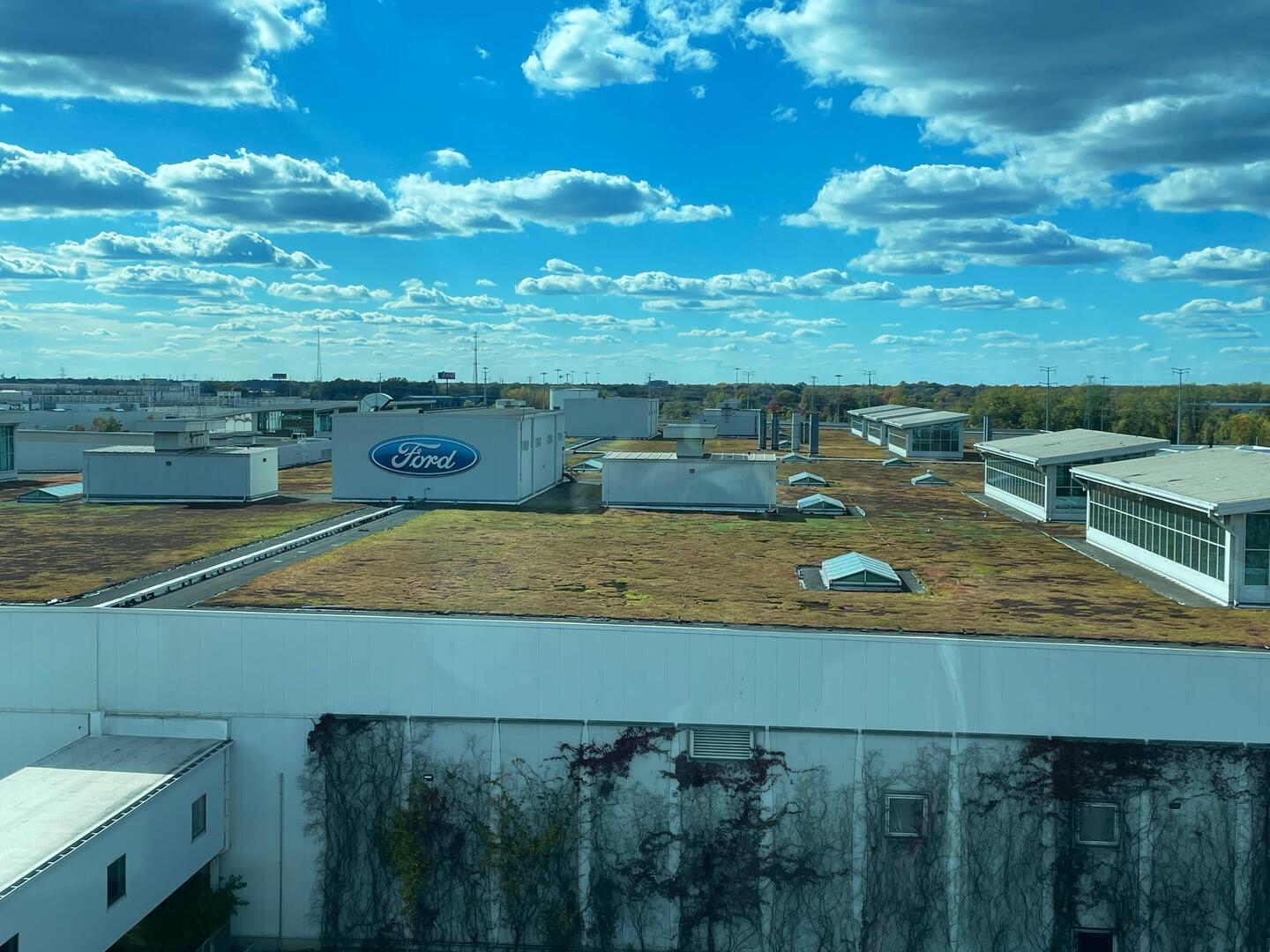 10 acres of living rooftop covered with 12 different sedums. Makes 20 degrees Fahrenheit difference inside in both winter and summer.