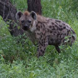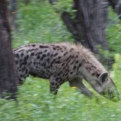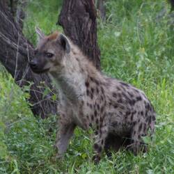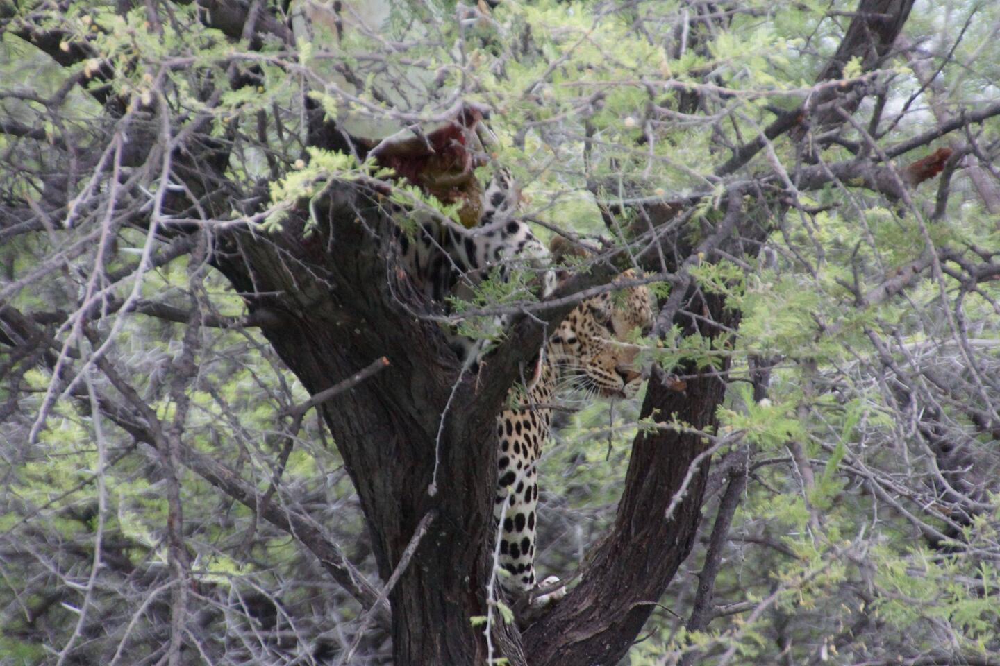 The leopard went up the tree and the hyenas waited below