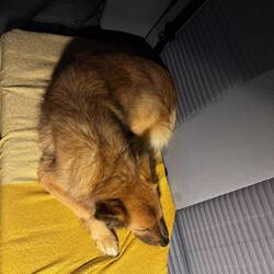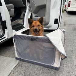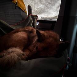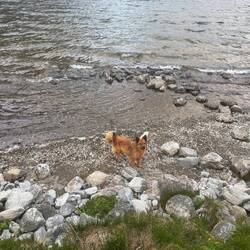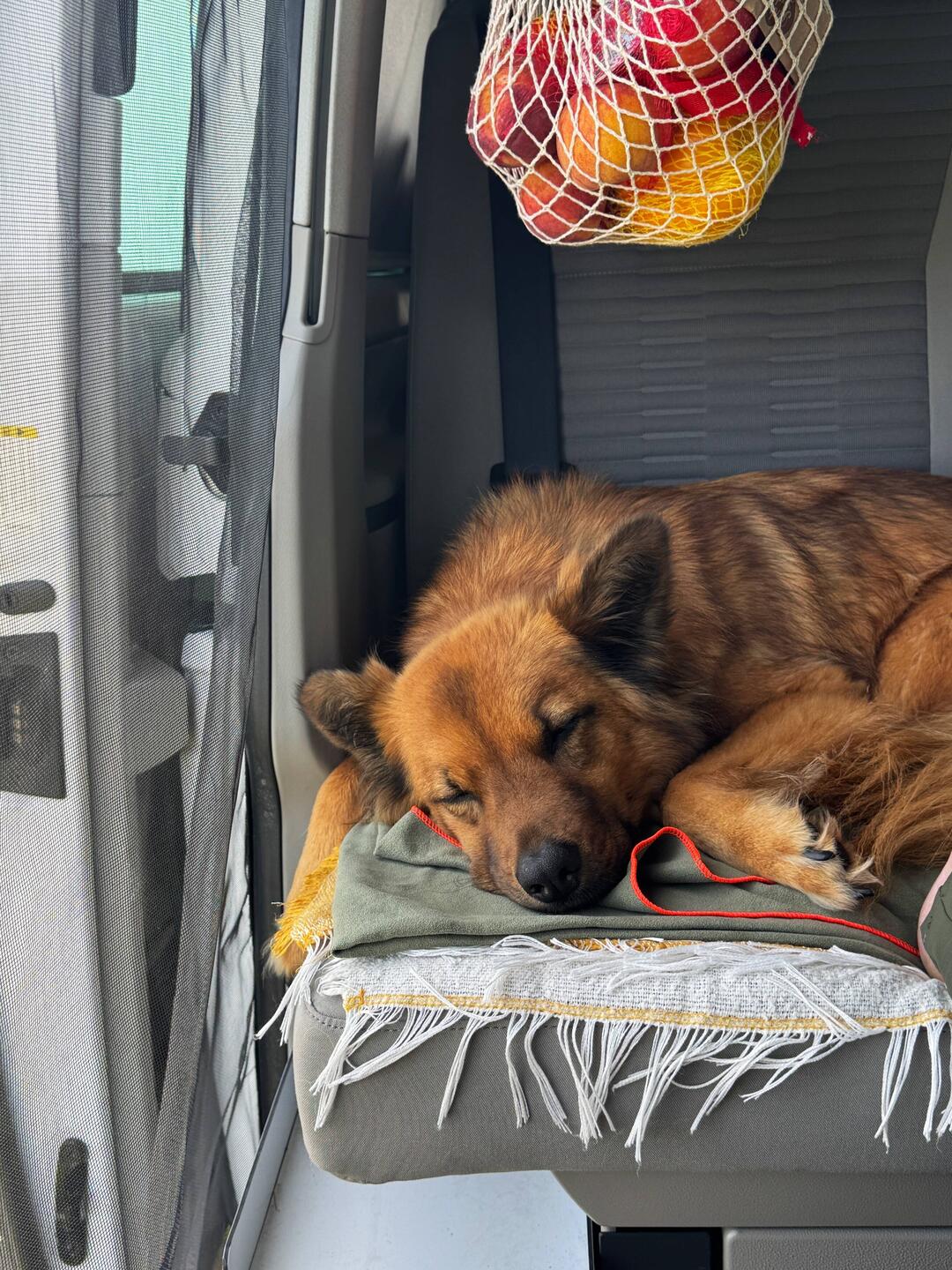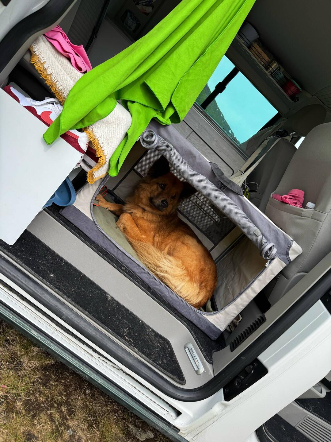 Nach der langen und extrem kurvenreichen Fahrt war eine Pause dringend nötig. Während Pascal und ich Kaffee und Kakao genossen haben, hat unsere Nuki bei 6 Grad erst mal ein Bad im See genommen – ganz die Abenteurerin 😅 Oder sich als Zirkusartistin auf der Hundebox versucht.