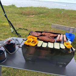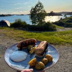 Zum Abschluss des Tages haben wir Würstchen gegrillt und Hot Dogs mit Meerblick gegessen. Danach noch ein kleiner Spaziergang ans Wasser – und dann endlich: die beste Dusche seit Langem!