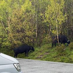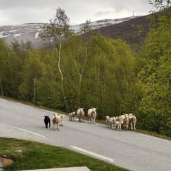 Der dritte Punkt auf unserer To-do-Liste lag etwas weiter entfernt, also hatten wir unterwegs noch reichlich Gelegenheit, neue Eindrücke zu sammeln – unter anderem bei einem Stopp in Gloppedalsura, oder auch mitten auf der Bundesstraße wo wir auch auf besonders niedliche Schafe gestoßen sind. 🐑