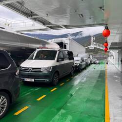 Nach dem Frühstück haben wir noch schnell den Wassertank aufgefüllt und uns dann auf den Weg nach Hirtshals zur Fähre gemacht. Dort angekommen, hieß es erst einmal einchecken und dann: warten – ganze 2,5 Stunden, bis wir endlich an Bord fahren konnten.