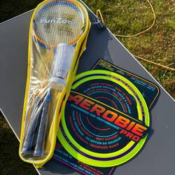 Fündig wurde er trotzdem. Eine coole Frisbee und ein Badminton-Set durften mit 🏸