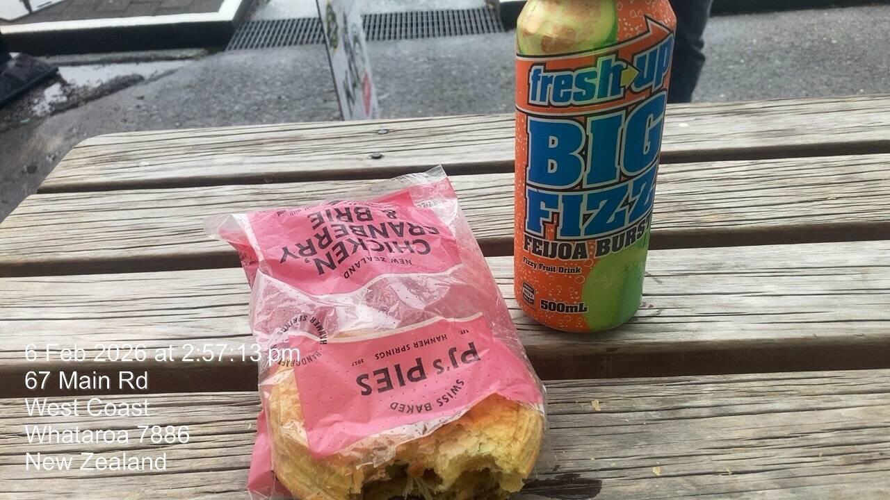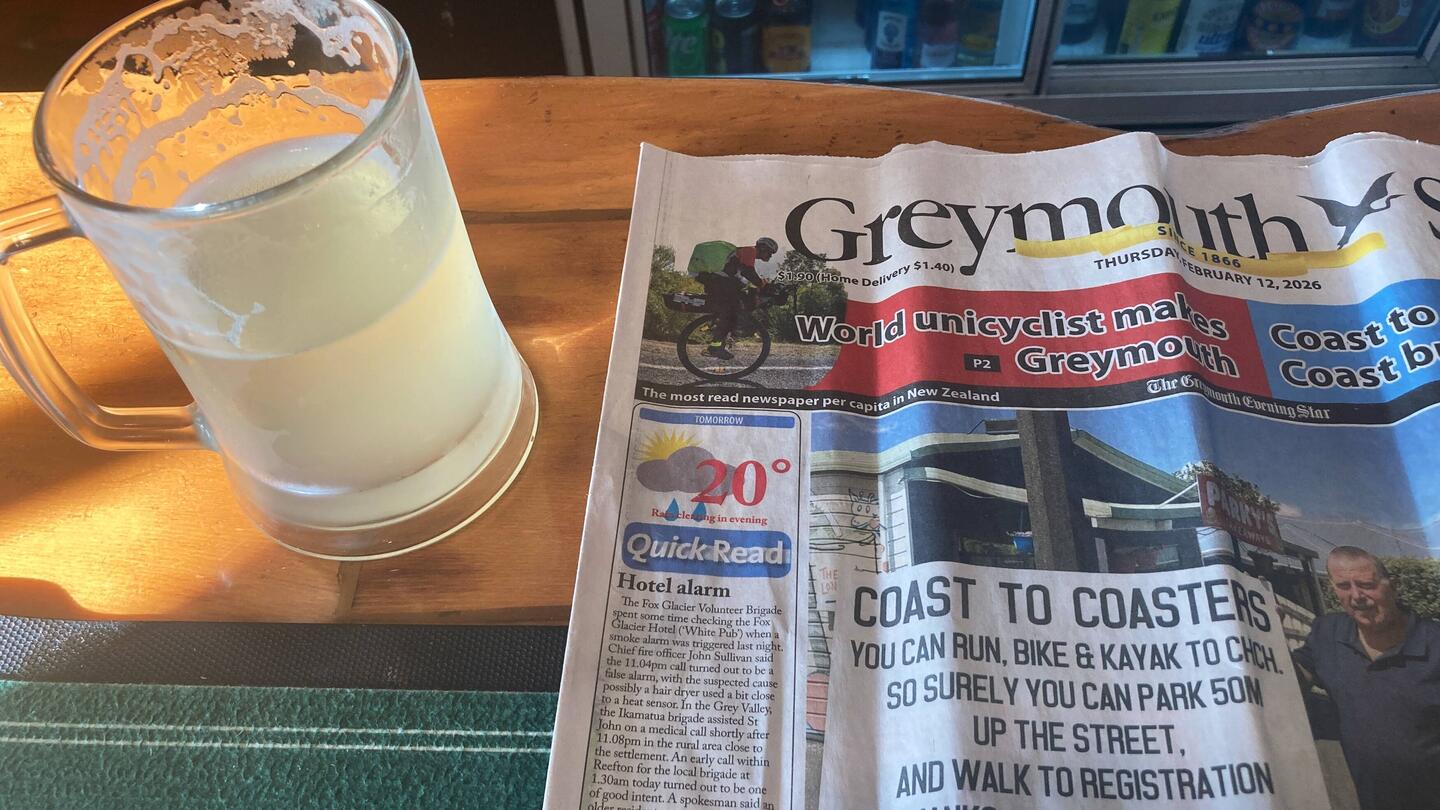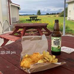 Having Cider and Fish ‘n Chips at Ikamatua Hotel