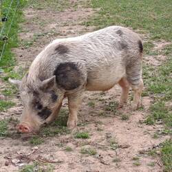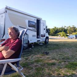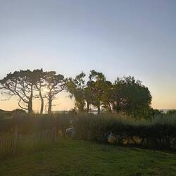 Abends. Auf unserem hinreißenden kleinen Campingplatz gibt es ein kleines Schwein für die Essensreste.