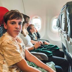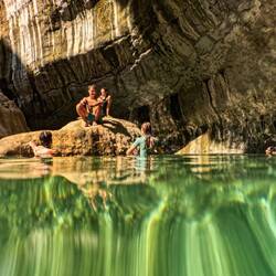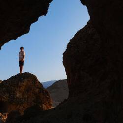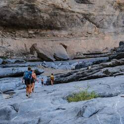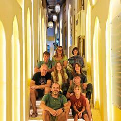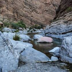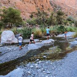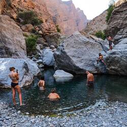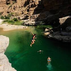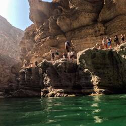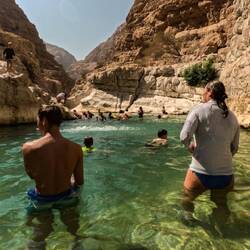 Danes smo imeli zajtrk z razgledom 🤩 Malo po 8i, smo bili že opremljeni za Wadi bani Khalid na poti proti soteski. Zopet smo bili zgodni, ker so ob petkih Omanci frej in je ta wadi, zaradi lažje dostopnosti, med njimi zelo priljubljena destinacija. V primerjavi z drugima dvema wadijem, ki smo ju obiskali, ima ta že tlakovano pot. Na koncu poti smo se spustili v čepe v eno jamo z zelo nizkim stropom in neverjetno toplim zrakom. Splašili smo nekaj netopirjev, slišali vodo in mislili, da bomo prišli do nje, vendar smo se raje obrnili, ker če bi ostali brez luči, je bilo temno kot v rogu. Potem smo jo mahnili kar naprej po suhi rečni strugi, med visokimi rdečimo stenami. Neverjetno, kakšne ogromne balvane reka nanase in premika, kadar je voda. V najožjem delu so bilo visoki tudi do 10 metrov, čez manjše smo še plezali, v neki točki pa je bilo nadaljevanje prenevarno, zato smo.se spustili nazaj do vodnatega dela. Potoboganali smo se v vodo in plavali s tolmuna v tolmun, v reki vseh odtenkov zelene barve. Skale ob reki so bile tu bele. Vsi otroci smo uživali, sploh v delu, kjer smo bili zopet povsem sami in smo plavali okoli in pod ogromnimi balavni. Tolmuni so večinoma globoki, toka ni, vmes greš kak odsek peš, pestro in fletno. Otroci pa najraje skačejo z visokih balvanov. Aljaž obvlada salte nazaj, ostali pa z višjih skačejo na noge. Danes je tudi Svit dobil dovoljenje, da skoči z najvišjega, visokega dobrih 6