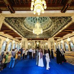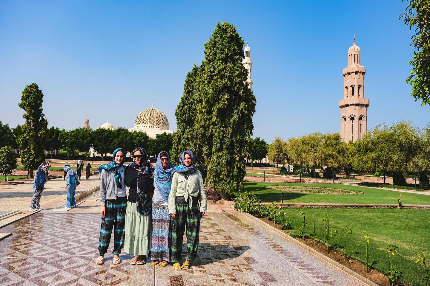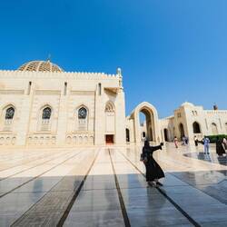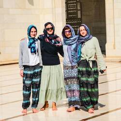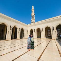 Noč je bila kratka, spali smo slabe 4 ure, saj je bilo treba vstati že ob 8- ih , če smo si hoteli ogledali mošejo Sultana Quaboosa, ki je za turiste odprta le med 8 in 11 uro. Za mošejo moraš biti primerno oblečen, fantje v dolgih hlačah, dekleta smo pa sploh morale biti zadekane od glave do peta. Ne smejo se videti niti lasje, niti gležnji, niti roke. Pred vhodom vojaki čekirajo in z veseljem pošiljajo turistke nazaj, da si še dodatno pokrijejo kak del telesa. Tudi me nismo bile izjeme, velika ruta čez glavo in roke ni bila dovolj. Obleči smo morale še dolge rokave. Tako oblečenemu te pri 32+ stopinjah pri ogledu sigurno ne zebe😀Mošeja se razprostira na večjem področju z vrtovi in večimi stranskimi stavbami, kupolami, minereti. Glavno molilnico, v katero vstopiš lahko le bos, krasi druga največja, ročno tkana preproga na svetu ter lestanci iz kristalov Swarovski, osrednji naj bi tehtal več ton. Res lepo, tudi barve in vzorci na stropu in stenah so čudoviti, različnih odtenkov modre, bele in bež barve. Kljub precejšnjem številu obiskovalcev, te notri prevzame en poseben mir. Ogled mošeje nam je vzel dobro uro .Hecno je bilo, da smo se srečali še z dvema slovenskima družinama in enim parom s katerimi smo se srečali včeraj na letalu, pa ne potujejo skupaj. Po ogledu smo poiskali en trgovski center za nakup hrane in vode za več dnevno samooskrbo. Vožnja po mestu je bila rahlo kavbojska. Imajo večpasovnice z omejitvijo na 100/120 km na uro ,veliko cest, malo možnosti za zavijanje v levo ter na vsake toliko krožno križišče . Ko nekaj iščeš nehote storiš kak lapsus. Prometa je kar precej, vozni park zelooo bogat, vozniki pa ok, niso agresivni, hupajo pa radi.
