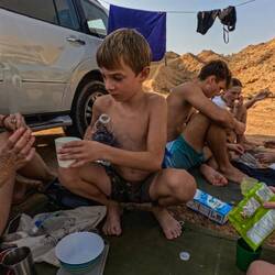 Noč je bila tokrat malce drugačno zvočno obarvana. Osli z različnih bregov so imeli skupinske vaje, najprej je začel en rigati, potem so se mu postopoma pridužili še ostali, seveda je vsak po svoje krulil in to v hribovitem svetu fletno odmeva, ponoči pa sploh. In ker so imeli vaje, so čez noč to večkrat ponovili🤪Zjutraj so zraven pritegnile še kokoši in petelini. Res čudovite simfonije. Tako, da ko se je ob 4:50 zaslišala jutranja molitev iz minareta, nas ni kaj pretirano zdramilo. Še preden jo sonce pokukalo izza hribov, smo bile starešine že pokonci. Jutra na prostem so čudovita. Ko pa se zbudiš nad globoko rečno sotesko in vasicami, gručasto raztresenimi po pustih, skalnatih pobočjih in ko sonce počasi ožari vrh za vrhom, in jih obarva v oranžno-rdeče odtenke, pa vse skupaj deluje naravnost čarobno. Za zvočno spremljavo se oglašajo kozice in ženska ter otroci, ki jih ženejo na pašo. Če bo veljal pregovor" Po jutru se dan pozna", nas čaka spet en čudovit dan. Prvi iz šotorov od otrok običajno priskaklja Svit, ostali mu nekako sledijo po starosti. Starejši najstniki najtežje vstajajo. Šotore pospravimo še pred prihodom sonca, ker potem hitro postane vroč. Zajtrk pojemo v senci, če je ne najdemo drugje, je med obema avtoma sigurno. Med oba avta vsak večer napnemo tudi vrvi, da sušimo mokre kopalke in brisače.