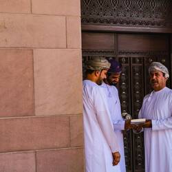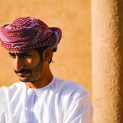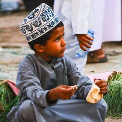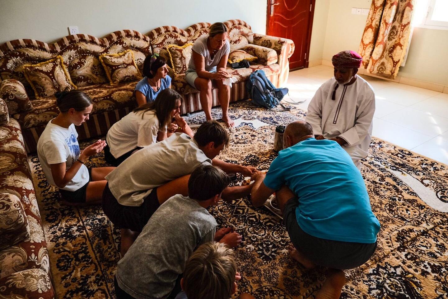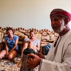 Na poti skozi Sinaw smo se ustavili za naš dnevni ritual, poiščemo mošejo, da natočimo pitno vodo, gremo na WC (mošeje imajo odprte in lepe wc-je, ločene za ženske in moške), in v trgovino po živež. Pri mošeji je Aleš mimoidočega možakarja v tipični beli obleki do tal in rdeči ruti na glavi, vprašal kje so WC-ji. Stekel je pogovor in možakar, po imenu Naser, ga je povabil na kavo, ko mu je Aleš povedal, da nas je 9, ni bilo nobenega problema. Vseh 9 se nas je znašlo v veliki sobi za goste pri Naserju, posedli smo se na preprogo na tla s spodvihanimi nogami,tako.kot je pri njih navada. Lahko bi se tudi na sofo. Nasar s svojo družino sicer živi v Muškatu, ima 6 otrok ( 3 hčerke, 3 sinove), najstarejši rojen 1988, najmlajši 2008. Delal je na Ministrstu za komunikacijo in je od 2018 upokojen. Rad potuje, sam, nekaj z ženo ali s prijateljem, tako je obiskal veliko azijskih držav ( Vietnam, Malezija, Tajska, Indonezija, Singapur), Gruzijo, Turčijo, Kirgizistan,Kazahstan, nekaj afriških držav in evropskih (Španija, Portugalska). Zato je bil zelo vesel, da nas je srečal in da smo sprejeli njegovo povabilo.Res prijeten in prijazen gospod. Omanci gostom najprej ponudijo sadje, zato nam je narezal pomaranče, granatno jabolko in en sadež, ki je bil med limono in pomarančo, sočno, vendar nič kislo, potem zelo okusne dataljne, potem smo so v posodi z vodo umili roke. Šele nato sledi kava, postrežena v majhnih šalčkah, ki jih napolnijo le do polovice, skodelico.sprejmeš z desno roko. Običajno popijejo več skodelic kave, ko imaš dovolj nič ne rečeš, le potreseš s skodelico v levo in desno. Omanska kava je meni res dobra, ker je s kardamonom, vendar jo razen pri domačinih ali v kaki mošeji drugače sploh ne dobiš za kupit tako, da je že narejena.