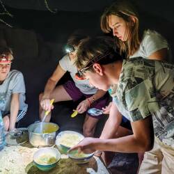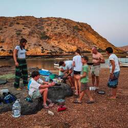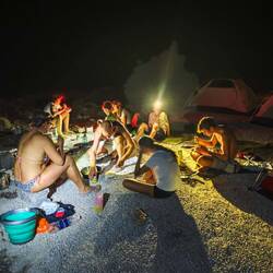 Vmes se je naš tabor že postavil, skuhali smo okusno večerjo, potem pa zakurili ogenj in ob taborniških pesmih pekli hrenovke in pence. Res en lep večer z veliko smeha in dobre volje. Malo po 21, še preden so zvezde zažarele sta nas temna noč in tišina zazibala v spanec. Šotore zopet nismo pokrila z vrhnjimi plahtami, da smo imeli razgled na zvezdnato nebo. Žal je luna že premočna, da bi lahko zasijale v vsej svoji veličini in številčnosti.Read more