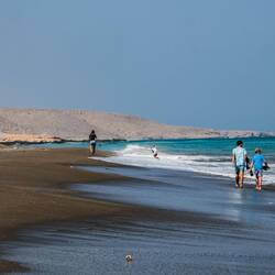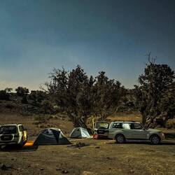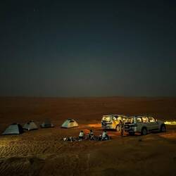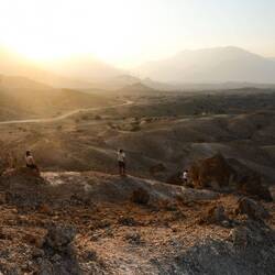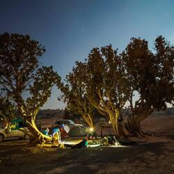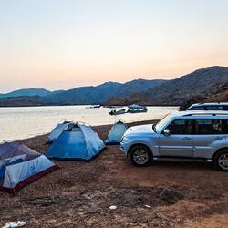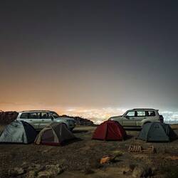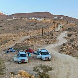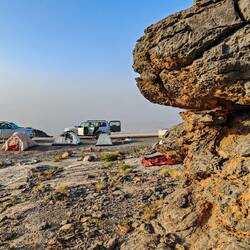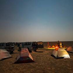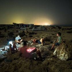 Pred nadaljevanjem proti hribovitem delu Omana smo se šli v morje umiti oz. sprati puščavski pesek z las in kože. Dolge sive plaže pri Al Khalufu so bile polne smeti, morje pa nizko, po barvi je bolj spominjalo na blatno jezero kot morje. Tako, da smo.se res le umili, sprali z vodo iz plastenk in šibnili naprej oz. nazaj, to je bila naša najužnejša točka v Omanu. Vmes smo šli v avopralnico oprati avte, ker sta bila od vsega peska, blata in soli res umazana. V Omanu pa za umazan avto lahko celo dobiš kazen. Preden nas je ujela noč, smo zavili z glavne ceste, ki vodi v Sinaw in naprej proti Nizwi, in na povsem ravnem, temno sivem področju poiskali prostor za naš tabor. Ob oranžnem sončnem zahodu smo vsi iskali dračje in les za taborni ogenj. Po postavitvi šotorov in večerji so fantje zakurili ogenj. Ogenj ima res svoj čar.Read more