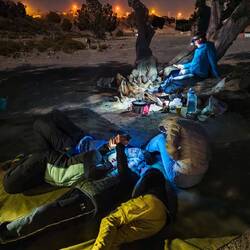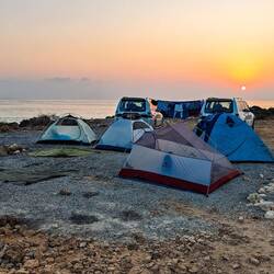 Sonce zahaja za hribe že okoli pol šeste, ob 18ih je že tema, tako da smo šotore postavili na peščenem platoju ob morju, le nekaj km pred Bimman Sinkhole, tik pred temo. Kočerjamo pa z naglavnimi lučkami v trdi temi. Siti in zadovoljni lažje planirano naslednji dan in v dobri družbi se večerni čas kar prehitro odvije. Sicer imamo mlajši in malo manj mlajši večerni krog, važno je,da se z obeh sliši živahno čebljanje in glasno smejanje, z mlajšega se celo kaka pesem zapoje👌Read more