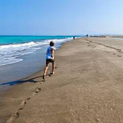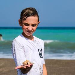 Za želve tudi otrokom mi bilo težko vstati pred šesto. Na plaži je ena želva ravno zaključila z zakopavanjem jajc in se napotila nazaj proti morju. Malih želvic ni bilo nikjer videti. Odpeljali smo se še do sosednje , daljše peščene plaže, kjer so bili pred leti že Prezlji in so videli kar nekaj želv tudi zjutraj. Tokrat smo eno veliko ujeli ravno tik pred odhodom v morje. Po plaži je bilo precej skopanih lukenj in ostankov jajc. Želve pridejo na peščeno obalo odlagat jajca, ko se stemni. Da skopljejo luknjo,kamor odložijo jajca, porabijo kar precej časa in napora, enako potem pri zakopavanju, pri tem poleg nastane nova luknja. Taja je pri eni luknji opazila male želvice. Sreča je bila na naši strani, male zamudnice so se izkopavale izpod mivke in hitele proti morju. Pot po peščeni plaži do morja je zanje kar dolga in nevarna, podnevi prežijo na njih galebi in tudi sonce jih lahko hitro izsuši, zato običajno lezejo ven ponoči ali zgodaj zjutraj.