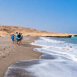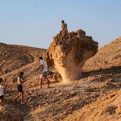 V Qurayyatu smo želeli videti flaminge v malem jezeru ter nekje na sklanati plaži korale na suhem. Flaminge smo videli,do koral pa smo prehodil skoraj km dolgo, peščeno plažo, kjer razen smešnih, "kot iz risanke", opisanih rakcev po Tajino in Aljaževo, nismo srečali žive duše. Visoki valovi , ki so z veliko močjo butali v skale, so skrili korale, so nas pa močno nasmejali , ko so skozi špranje v skalah povzročili tako moča piš, da je Mohorju odneslo kapo nekaj metrov visoko v zrak, ogrizek od jabolka,ki ga je Svit metal v špranjo pa je vsakič z veliko silo zletel nazaj iz špranje visoko v zrak in nekaj metrov stran od špranje. V glavne smeha še pa še😆😆😆 Na plaži je sledilo afnanje po valovih, temna mivka vsepovsod.Hecno in hkrati fino pa to,da smo bili na ogromni plaži povsem sami. Naslednja postaja so bile peščene strukture,ki po obliki spominjajo na gobe, ujeli smo jih v lepi , večerno -oranžni svetlobi.Nahaja pa se nekaj km iz gl.ceste pred Dibabom, v notranjosti.