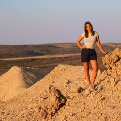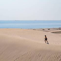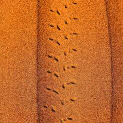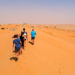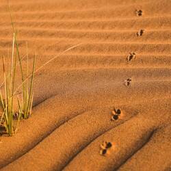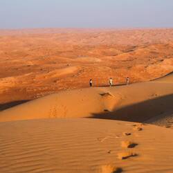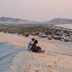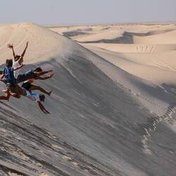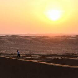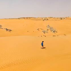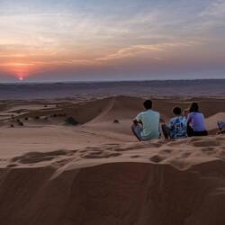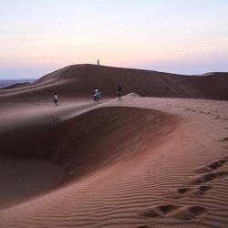 Ko smo le našli lep prostor stran od poti in pod višjo sipino, smo najprej navdušeno zagrizli strmo navzgor. Kmalu so naš tempo upočasnile pekoče noge in pomanjkanje sape, mestoma smo nadaljevali celo po vseh štirih. V vseh se je prebudila otroška duša, afnali smo se in skakli z vrha sipine in po pesku kot majhni otroci. Svit je kmalu imel pesek povsod, v laseh, ušesih, še v očeh. Tako smo se razživeli, da smo komaj ujeli sončni zahod. Potem pa otroci in možje gasa modrasa naravnost navzdol, midve s Katjo pa sva uživali v tišini in večernih barvah puščave.