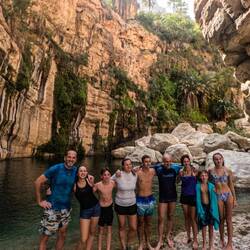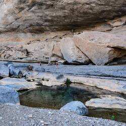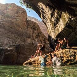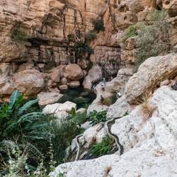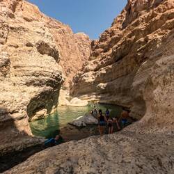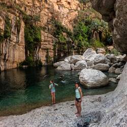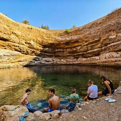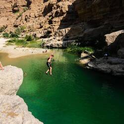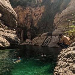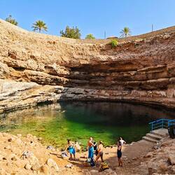 Tako nam je uspelo, da smo bili ob 8ih že v Bimmah Sinkhole, podornici s sladko-slanim jezerom zelene barve, polnim lačnih ribic. Zaradi zgodnje ure smo bili edini kopalci, tako smo bili deležni poštenega grickanja in žgačkanja s strani ribic. Otroci pa se kazali tudi mišice ob vodnem plezanju. Potem pa v nekaj km oddaljen Wadi Shab. Wadiji so rečne struge, nekatere so večji del leta povsem suhe, nekatere pa imajo del vodnatih odsekov in tolmunov. V primeru dežja pa je značilno, da se zaradi slabe prepustnosti kamenim, zelo hito napolnijo z vodo in se spremenijo v široko, blatno in deročo reko.