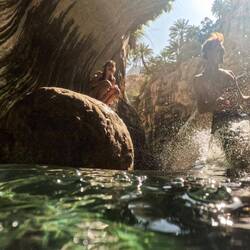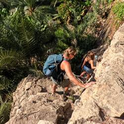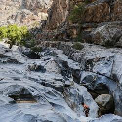Noč na platoju nad klifom je bila polna glasnega bučanja močnih valov, ki so udarjali v stene in špricali na obalo, zvoki so občasno spominjali na grmenje. Sicer zaenkrat spimo v šotorih brez vrhnje plahte, ker je ponoči dovolj toplo. V valovitem morju so otroci s klifa opazili kar precej želv, na kopnem pa zvečer pod kamni iščejo škorpijone in kuščarje. Pravi raziskovalci. Po zdaj že običajni jutranji rutini smo jo ob 8ih odrinili v wadi Tiwi. Nahaja se malo južneje od Wadi Shaba in je malo težje dostopna in zato manj obljudena. Pelješ se po, za en avto, ozki, mestoma izredno strmi, cesti med zelenimi oazami s tipičnimi vasicami z belimi hiškami obdanimi z zidanimi obzidji. Se kar precej in strmo dvigneš nad dokaj ozko rečno dolino, obdano z visokimi rdečimi stenami, polno podrtih balvanov in skal. K sreči smo bili zgodnji in nismo srečali veliko avtov, tistih par pa smo srečali na primernih mestih, da smo se lahko umaknili en drugemu. V zadnjo vasici je parking za cca. 10 avtov, kjer smo se pripravili za vodno dogodivščino. Pot do reke sta nam pokazala dva fanta z vasi, na ta način služijo denar. Sicer se v teh vaseh ukvarjajo s kmetijstvom, gojijo dateljeve palme, mango, banane in papajo. Vendar je zdaj pri cca. 35 stopinjaj tu "zima", zato sadja ni. Pot gre čez nasade palm in ostalega bujnega rastja ter polj, strmo navzdol čez skale, mestoma je nameščena veriga ala zajla za pomoč, ker skale malo drsijo. Potem pa prideš v pravi raj, zelen tolmun, obdan z belimi skalami in stenami ter pisanimi oboki, poraslim z zelenjem, s katerega kaplja voda, ki ustvarja efekt tuša. Ker je ozka soteska, sonce ne pride povsod do vode, tako je tudi voda bolj sveža. Ko so bili Mohorčič "lansko leto" tu, so startali višje in se nato od tu vrnili po vodi do izhodišča, zato smo "vodiča" prepričali, da gremo sami gor in po reki nazaj dol. Tako jima ni bilo treba nositi naših nahrbtnikov za nami, nam pa se pa ni bilo treba vračati nazaj po cesti. Wadi je res čudovit, zeleno, turkizni odtenki tolmunov, vmes slapovi, z mahom porasli naravni tobogani in pisane stene ter oboki, vmes pa zeleno rastje. Kot bi bil v enem skritem biserčku sredi džungle. Doživetje je bilo še bolj pristno, ker smo bili edini obiskovalci. Otroci so uživali 100/uro: skakali, plezali na balvane v vodi, se spuščali po naravnih toboganih- čisto pravi naravni Aquapark. Na koncu tega dela, ki se ga da obiskati je slap, ob slapu pa po visokem balvanu s pomočjo vrvi splezaš na vrh slapu, kjer se vije vodna drča z višjega tolmuna, ki se konča z lepim slapom. Pod slap smo se šli "tuširati" in masirati, pa seveda slikati. Ko smo se naužili vseh lepot, so prišli še eni turisti. Hitro smo se spustili nazaj po balvanu, da smo uživali "v samoti" 9ih razgrajačev še na poti navzdol do izhodišča. Spust z avtom nazaj v dolino je bil prava avantura, med potjo smo v reki oprali še avte in mimogrede sta fanta "oprala" , beri namočila kratke hlače in majice. Če se že dela, naj se dela ornk.🫣 Vroče sonce vse hitro posuši, tako da se ne sekiramo kaj dosti.