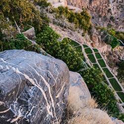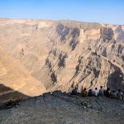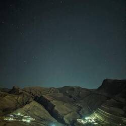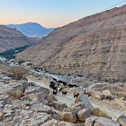 Na poti nazaj smo se ustavili še na razglednikih ob cesti, ki so še nad steno nad potjo . Najlažje je, da se uležeš na ravno vrhnjo ploščad in pogledaš skoraj navpično navzdol v 1000 metersko globino, res noro. Precej lažje je to narediti, kot pa gledati otroke, ki gledajo čez rob. Nekateri na teh ploščadah taborijo, mi smo to misel opustili po pretekli noči, na 2.350 m n.v. je ponoči premrzlo. Spustili smo se na nadmorsko višino 1050 m in si že v trdi temi poiskali prostor za spanje nad vasico Misfat Al Abriyeen. Povečerjali smo na skalnatem platoju v soju polne lune🌕Read more