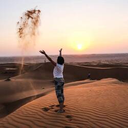 5-6 m. Kakšno veselje in ponos! Osveženi in umiti (nevede smo se stuširali pri nekomu doma na vrtu🫣) smo jo mahnili proti puščavi Wahibia Sands, ki.se razteza v velikosti 180×80 km vse od notranjosti do Arabskega morja. Vmes pa še obisk mošeje, kjer vsak dan tankamo vodo v naše plastenke. Predvsem zato, da ne potrošimo in smetimo s plastiko, ki jo je že tako preveč povsod naokrog. Danes smo si pri mošeji postregli še z okusno omansko kavo s kardamonom.