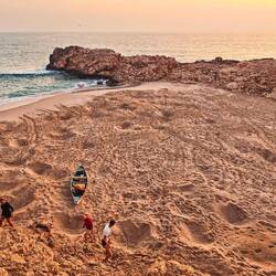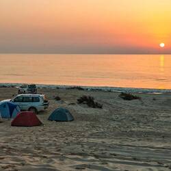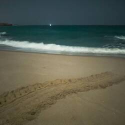 Po vrnitvi s puščave smo šli na pumpo nafilati nazaj gume. Po 2 urah vožnje nazaj proti morju, smo ob sončnem zahodu prišli do kraja Rus al Jins, kjer smo upali, da bomo na peščenih plažah videli želve, ki pridejo ponoči izležti jajca in zjutraj mogoče celo male želvice, ki se izležejo iz jajc in hitijo proti morju.
