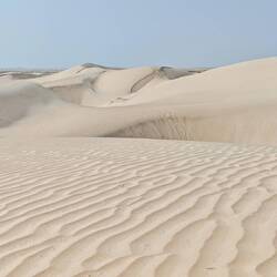 Sončni vzhod sem ob 6:15 pričakala na beli sipini s pogledom na morje. Levo široka bela prostranstva, porasla z nizkimi zelenimi grmički, za mano in desno pa bele in krem bele sipine kot meringo tortice. Pa razen nas in nekaj ribičev na morju, nikjer žive duše. White suger dunes (Bela puščava) po strukturi spominja na fino, sipko, belo moko ali sladkor v prahu, zaradi svetle barve tudi ni vroča, posebna in impresivna je tudi zato, ker sega čisto do morja. Ni puščava v pravem pomenu besede, vseeno pa sipine obsegajo področje veliko cca. 50-70 kvadratnih kilometrov. Bele sipine pa delujejo zelo nežno in prefinjeno. Ko nas je vseh 9 prilomastilo s šotorov in se podalo na sveže, od vetra poratrakirane, sipce in začelo skakati in zvirati na vse konce in strani je bilo konec z nežnimi vzorci. Imeli smo jih povsem zase in smo dali veselju duška.