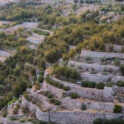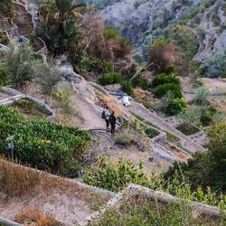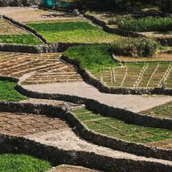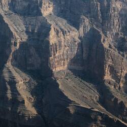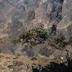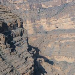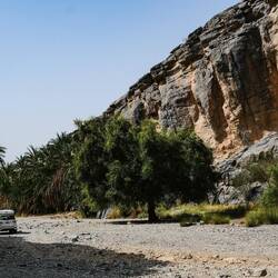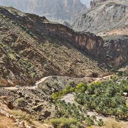 Vroč del dneva smo preživeli v Wadi Muaydin, simpatičen, hodiš lahko kar nekaj časa ob ali po strugi in se kopaš v lepih tolmunih. Srečali smo še 4 starejše Francoze, drugače smo bili sami. Proti večeru smo se dvignili na Jabel al Akdhar (t i. Zelena gora), sicer je bolj planota, res pa je,da je nekoliko bolj porasla z grmičevjem in tudi vasice, zgrajen v strme bregove imajo terase s felaji, namakalnim sistemom, kje gojijo različne vrtnine in sadje, od koruze, granatna jabolka, papaje, mango,videli smo celo grozdje in orehe ter kaktuse. Vzpon po cesti do Jebel al Akdhara je dovoljen le z vozilom na 4 motorni pogon in preden se začne vzpon je prav check point, kjer policaj preveri, če imaš ustrezen avto, tudi table ob cesti na to opozarjajo. Sam vzpon sicer ni problematiče, cesta je široka in asfaltirana, problem je dolg, skoraj 30 km dolg spust, ceste so na odsekih strme in moraš zavirati z motorjem, ker bi drugače zavore skurilo. V ta namen imajo na vsake toliko tudi posebna izletišča.