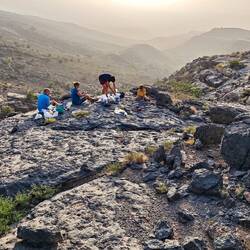 Okoli 6ih je naša omanska ura za vstajanje, brez budilk. Sončni vzhod smo starešine pričakale na platoju nad dolino in vasico. Žal je te dni tudi v gorski svet prineslo puščavski pesek z Arabskega polotoka, zato je vidljivost zelo slaba. Šotorili smo tik ob cesti, ki vodi navzgor do manjše vasi in po 6i uri se je kar začel "promet", enih pet je bilo sigurno šolskih jeepov, ki so peljali otroke v šole. Vsi so se mimo nas peljali uvidevno počasi, da nas ne bi s prašnim makedamom zaprašili in nam prijazno mahali.