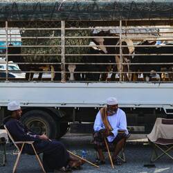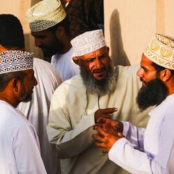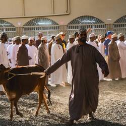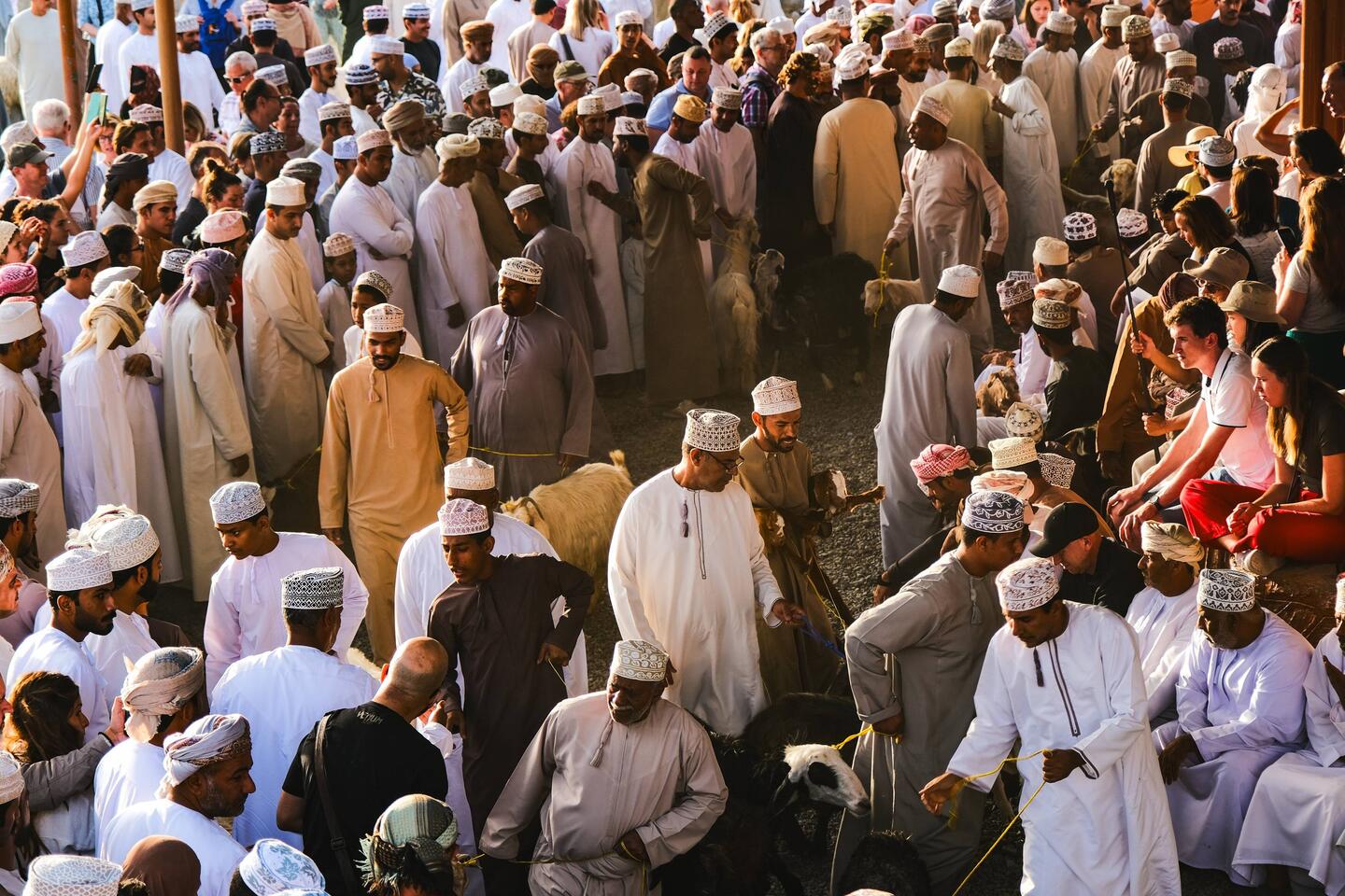 Zbudili smo ob petelinjem koncertu, muzejina sem tokrat prespala. Danes gremo v Nizwi na goat market- tržnico s kozami, ki se odvija vsak petek od 6:30 do cca. 9 ure zjutraj. Ob 7ih je bilo okoli tržnice že vse polno ljudi in avtomobilov. Moški vsi v dishdashah, dolgih belih oblekah do gležnjev in z dolgimi rokavi ter kummo, vezeno kapico na glavi. Redke ženske pa v črnih oblekah do tal, s pokritimi lasmi, nekatere tudi s pokritimo obrazi.