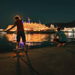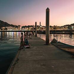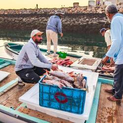 V marini smo se vsi stuširali, potem "ogvantali" v primerna oblačila za na Mutrah Souk ( največjo tržnico, bazar v Muškatu). Parkirali smo v marini ob Sultanovi razkošni jahti peščene barve in velikosti skoraj trajekta za na Korziko. Za na bazar smo se razdelili v 2 tabara, moški in ženski del. Fantje so šli na hitro skozi in potem na pomol loviti ribe, me pa v shopping. Kmalu smo dišale vsemogočih dišav, saj so nas prodajalci kar mazali z roloji po rokah, ko smo šle mimo trgovin, vabili so nas v trgovinca in nam ponujali šale, skodelice, začimbe, vsemogočo robo Sploh jih nisi smel pogledati, ker potem si bil že v trgovini. Kljub temu smo uživale, se najedle dateljev in slaščic napile kave in čaja. Našle smo tudi opremo za našega prihajajočega Abrahamovca😃 Vse uličice te kar mal deorientirajo, brez google navigacije bi komaj našle pot nazaj do naših fantov😉 Tudi njim je čas minil kot bi trenil, uspešno so lovili ribe, se pogovarjali z ostalimi ribiči, tako da jih naša pol urna zamuda sploh ni zmotila. Želodčke smo šli napolniti v eno izmed uličnih, dobro obiskanih restavracij z različnimi swarami, kebabom podobnim zavitkom z zelenjavo in mesom in svežim juicom. Odlično 😋 Čas nas je spet prehitel, ura je bila že 21, ob 22ih smo morali oddati avto.Kar na parkingu, smo vrgli ven šotorko in vso robo iz avta, da smo po "cigansko" spakirali prtljago v potovalne torbe in kovček🙃
