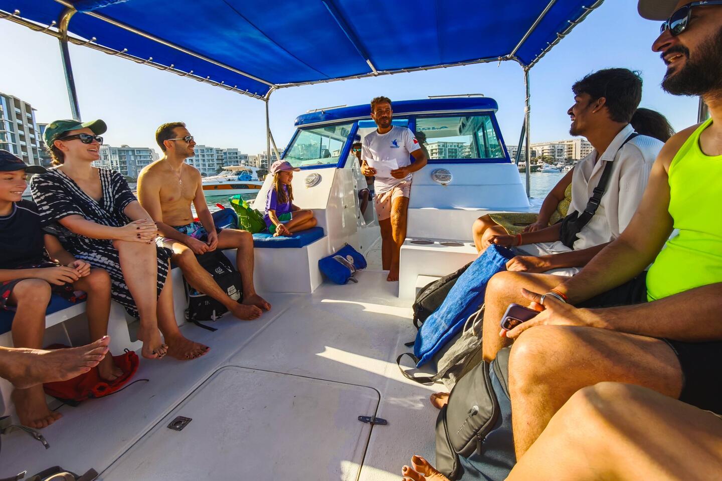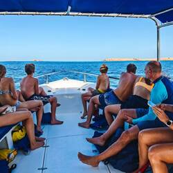 Danes nas je po dolgem času prebudila budilka. Malo pred 8o smo bili že v marini Al Mouj pri Mola Mola agencijo za snorklanje in potapljanje, kjer so nas že čakali pripravljeni poimenski paketi s plavutkami im maskami. Katja je snorklanje rezervirala že nekaj mesecev pred odhodom. Na naš čoln je šlo okoli 20 ljudi, vodič in šofer speedboata. Oba sta bila posrečena in zelo prijazna.