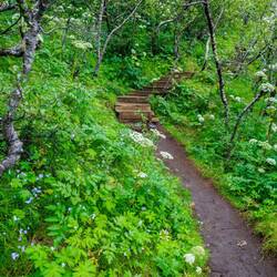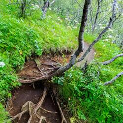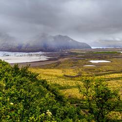 Auf einem schmalen, rutschigen und verwurzelten Pfad ging es mit Blick auf die Gletscherzunge und dem Gletschersee hinab zum Skaftafell-Basiscamp, wo mein Jimny auf mich wartete.