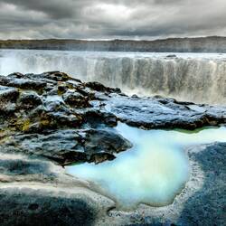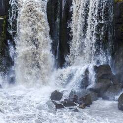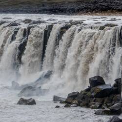 Ebenfalls am Jökulsá á Fjöllum und zu Fuß vom Dettifoss über Felsen erreichbar: der imposante Selfoss.