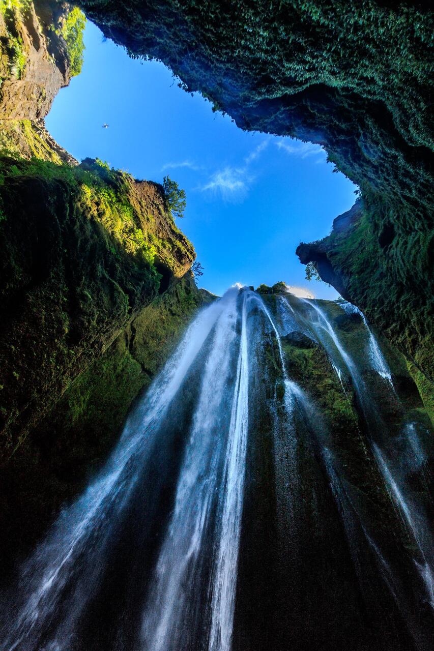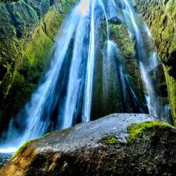 Der Gljufrabui-Wasserfall ist nicht weit vom Seljalandsfoss entfernt und hat ebenfalls etwas Besonderes: er stürzt sich innerhalb einer Felsspalte in die Tiefe. Diese Felsspalte kann gegangen werden.