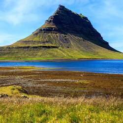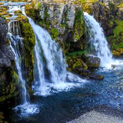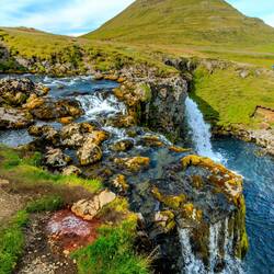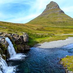 Fotostopp am Kirkjufellsfoss mit dem berühmten Kirkjufell im Hintergrund.